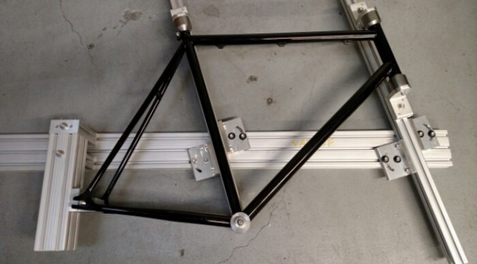 With the cost of frame jigs exceeding the value of my car I decided a little while ago to slowly build my own. Well, the time is here. My jig is done!!!! It’s obviously has quite a bit of influence from the Arctos jig made from 80/20 extrusion.