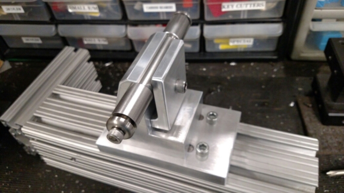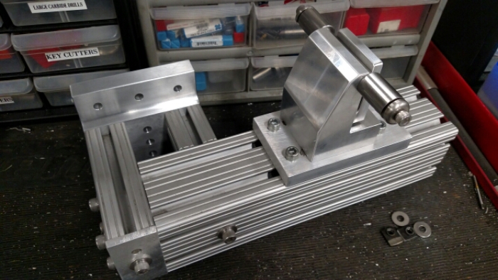 Next I designed and machined a plate to mount the whole rear dummy axle fixture onto and it’s pinned into the slots in the main extrusion to allow it to slide back and forth easily.