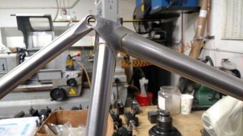 Now, I had to mount a frame in there to calculate the the bottom bracket centerline and adjust the cone accordingly on it’s 1/2-20 threaded center stud. In this pic you can see how the HT and ST cones are higher than the tubes.