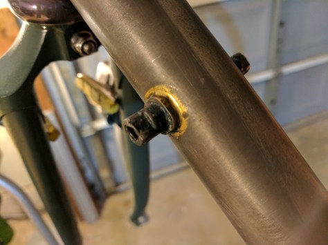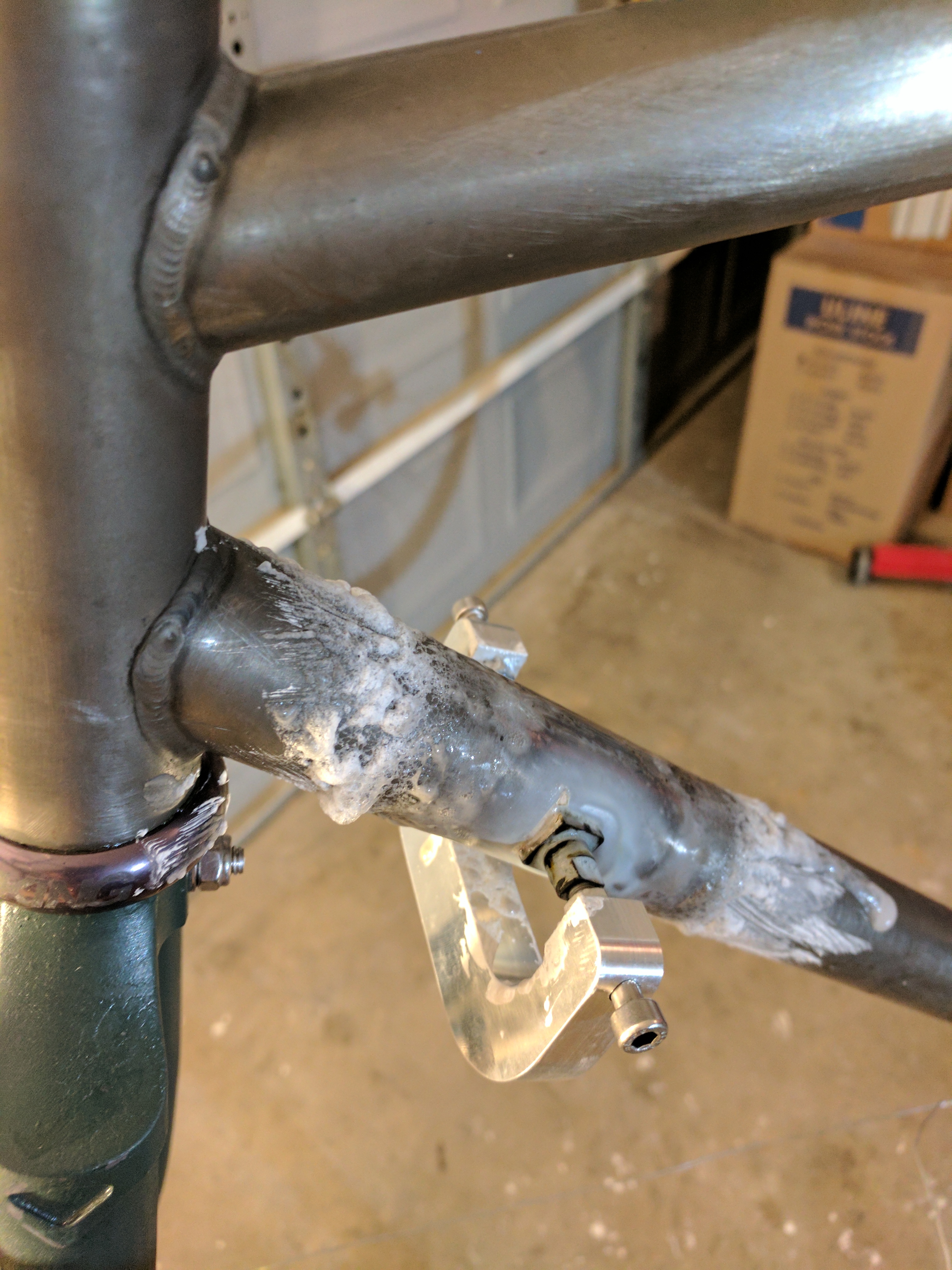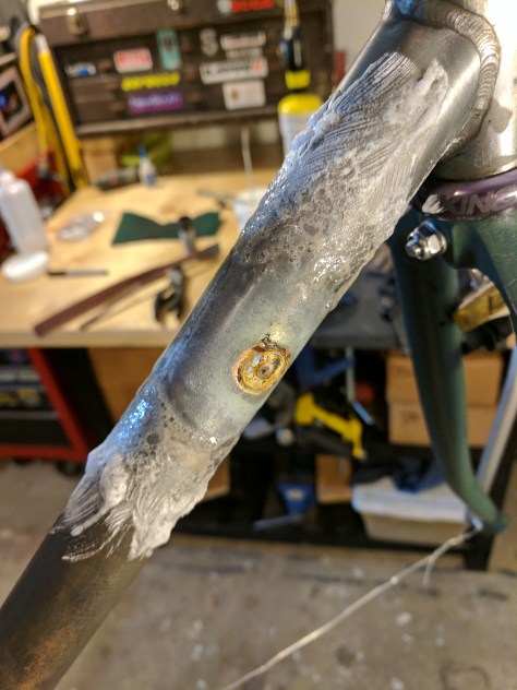 Let me set the scene here for you. Mike came up to my garage (shop if you will) and I gave him a little more rear end clearance. His rims are really wide so it made the 35mm wide tire both wider and larger in circumference. So he got a seat tube dimple! Now he has 3 mm of clearance!