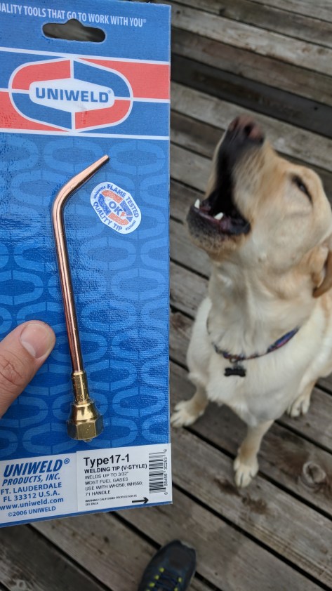 Then there is the tip. (Insert “just the tip joke”) From what I am finding, for fillet brazing you want a small, cool tip. I started with a Uniweld 17-1 tip (or most call it a #1) and then got a smaller 17-0 tip (#0). So far I like the #0 better. I think as I get more control over the torch I will switch back to the 17-1 for faster heating. Right now I don’t mind taking my time with this.