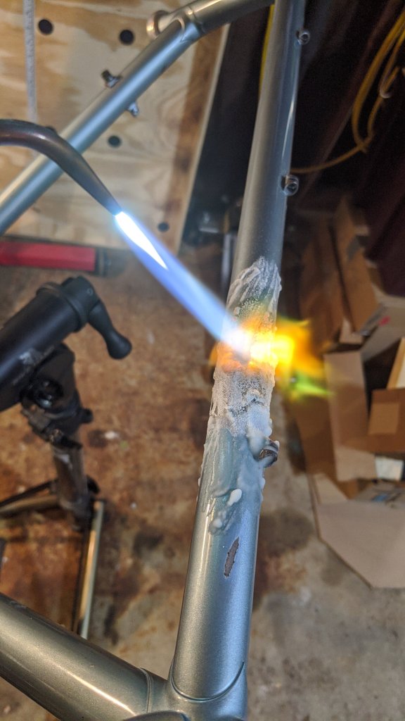 Step 6. Prep the frame how you would for brazing a joint but make the dent face perpendicular to the ground (straight up) this way gravity will help keep your bronze in place.