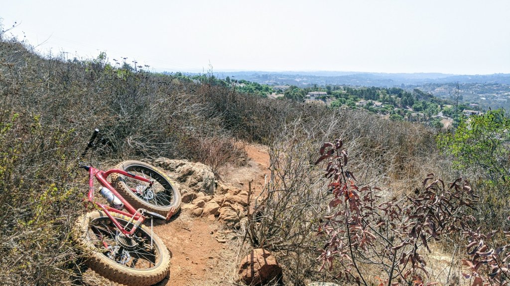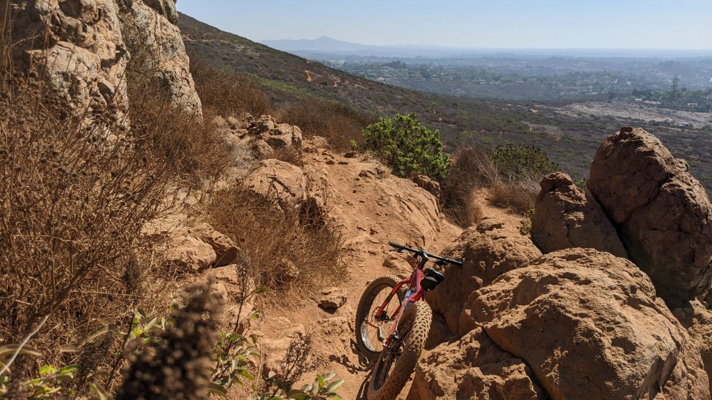 Well, then we moved to North San Diego County and I got a job where lunch rides in the hills around San Marcos were almost a daily thing. Excited to participate and kind of knowing what trail conditions to expect, I put another pound of air in my tubes and set off for my first lunch ride. The trail was SO much rockier than I expected. I’m not talking rounded river stones either. Blades, spikes, spades and scissors are a better way to describe the rocks in these reddish ribbons of dusty trail. But, none the less, my first ride went off great! No flats, seemed to have a little too many psi’s in there but, good baseline.