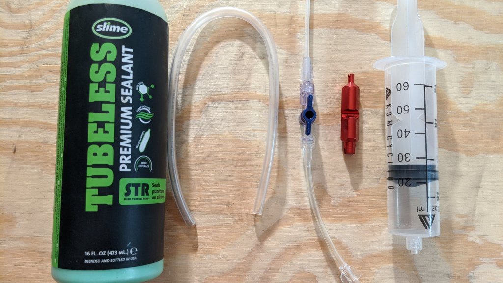 I read up on the conversion and gave it a go! I had rounded up a length of 3/16″ ID clear poly tube to use from my air compressor to the valve stem and shot some air into the tire! Pop! Right on! I hardly even heard any air leaking between the split tube and the tire. Added 4oz of Slime tubeless sealant that I had gotten at a CX race in MPLS and took it for a spin around the neighborhood. Done. Pumped it up to 10.5 psi (where I ran my tubed Framed tires) and went to bed. Next morning, still reading 10.5!