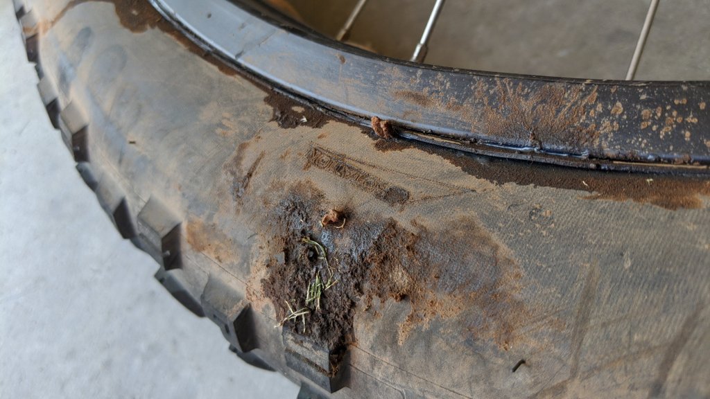 Sidewall bite! Sealant isn’t stopping it. Crap! I need a plug or I’m walking out too!  Lucky for me the leak was slow enough that I could pump it enough that I could ride for a half mile or so then pump back up, half mile, pump, half mile… Made it back to the shop. Rough day for tires in San Marcos!